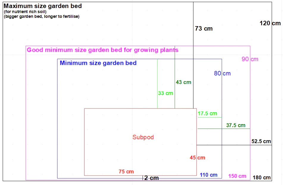 For a single Subpod, this will work well for a raised garden bed of about 3 feet/90 cm by 5 feet/150 cm. A garden bed smaller than this will simply be enriched faster. If your garden bed is larger, you have the option of adding an additional Subpod(s) or simply letting it take longer to enrich the garden bed.